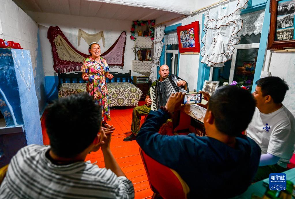 6月28日,考占花(左)为游客们唱歌,萨沙在拉手风琴。考占花是俄罗斯族,2004年开始经营俄罗斯族家庭游。