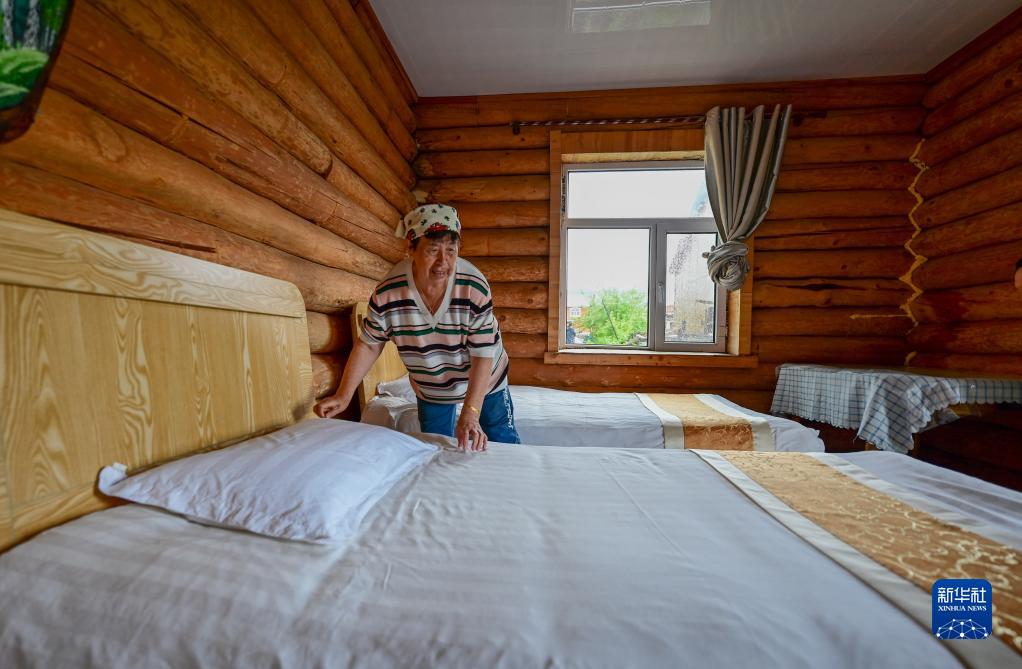 6月28日,卓娅在收拾客房。卓娅一家从2003年开始经营家庭游,从最初的4间客房已经发展为24间,还能提供旅游项目服务。