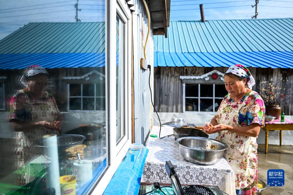 6月28日,考占花在制作肉饼。考占花是俄罗斯族,2004年开始经营俄罗斯族家庭游。
