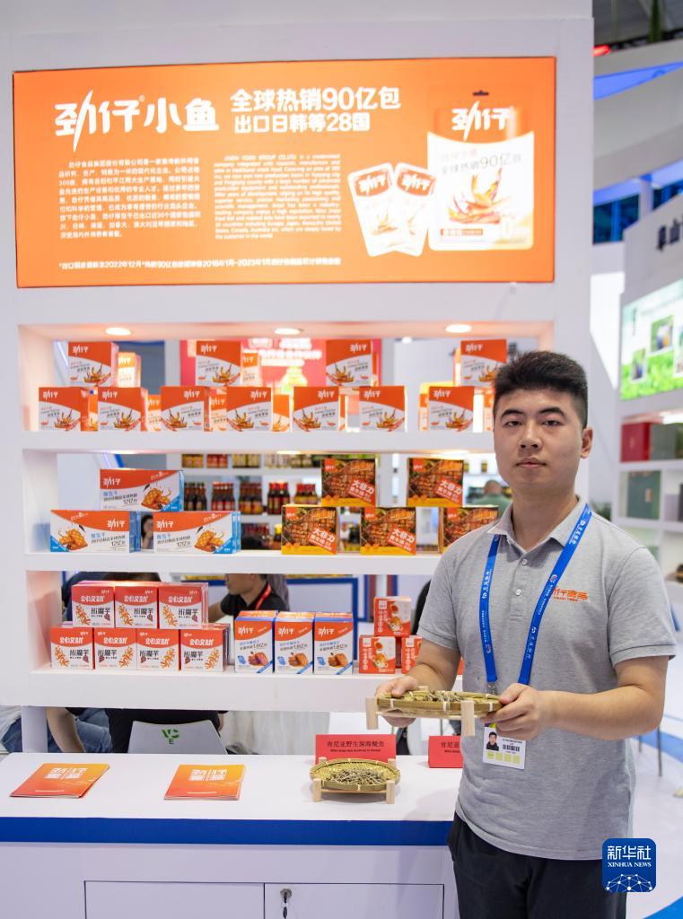 在第三届中非经贸博览会主展馆长沙国际会展中心,工作人员展示肯尼亚野生鳀鱼产品(6月29日摄)。新华社记者 孙瑞博 摄