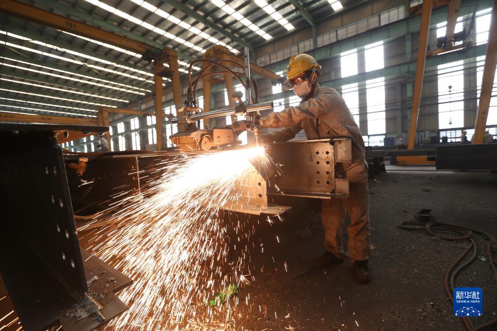 6月25日,工人在四川省眉山市一钢构企业车间加工钢构零部件。