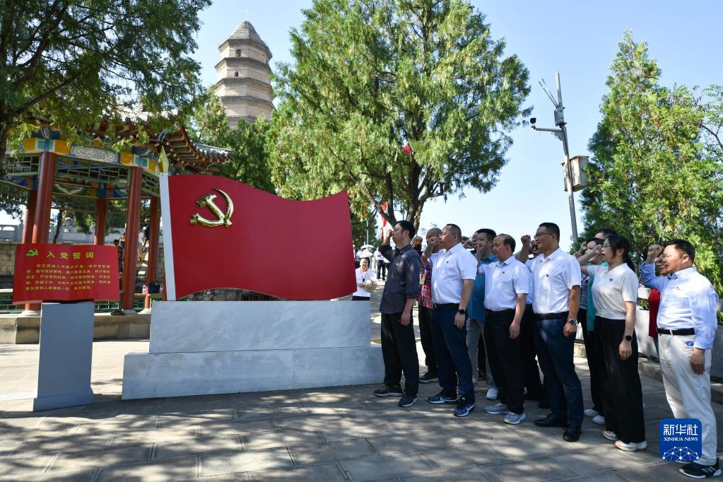 6月30日,在延安宝塔山参观的党员干部重温入党誓词。