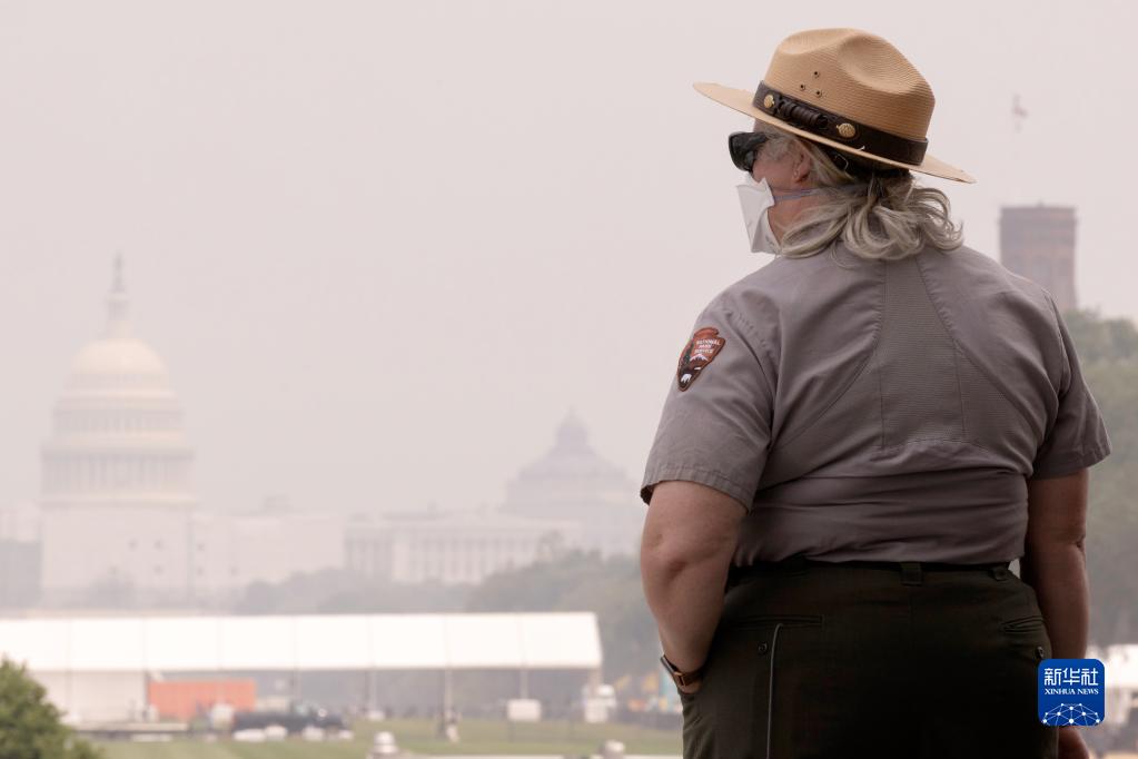 6月29日,在美国首都华盛顿,国家公园的一名员工戴着口罩工作,远处的国会大厦笼罩在烟雾中。