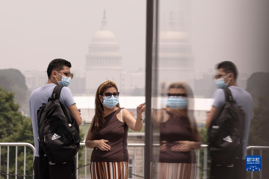 6月29日,在美国首都华盛顿,游客戴着口罩在华盛顿纪念碑游览,远处的国会大厦笼罩在烟雾中。