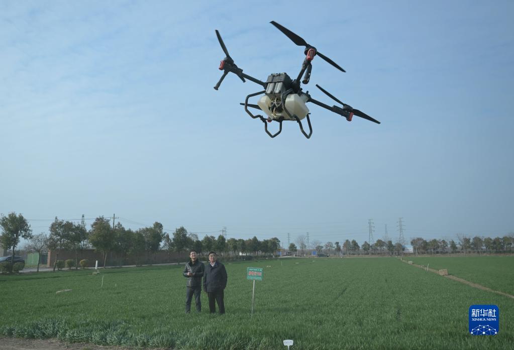 2月21日,在太和县淙祥现代农业种植专业合作社,徐淙祥(右)和孙子徐旭东查看无人机喷洒农药。