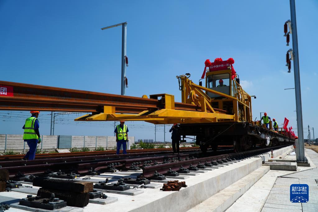 6月30日,在位于山东省烟台市蓬莱区的潍烟高铁施工现场,中铁一局铺轨机组施工人员在进行铺轨作业。