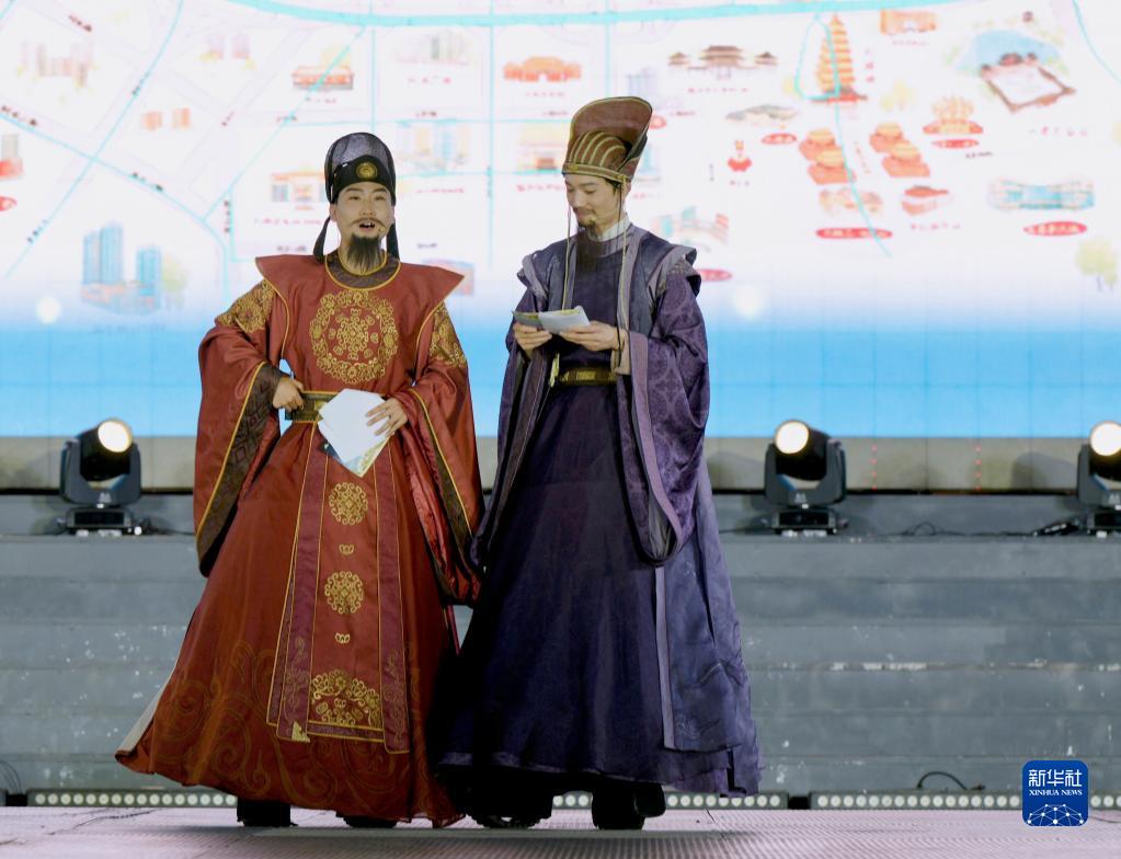 6月29日晚,西安大唐不夜城互动节目“盛唐密盒”的演员现场推介夜间消费季活动。
