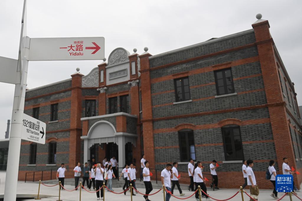 6月30日,游客从嘉兴火车站1921复建站房走出,准备步行沿着新时代“重走一大路”红色旅游路线前往南湖旅游区。