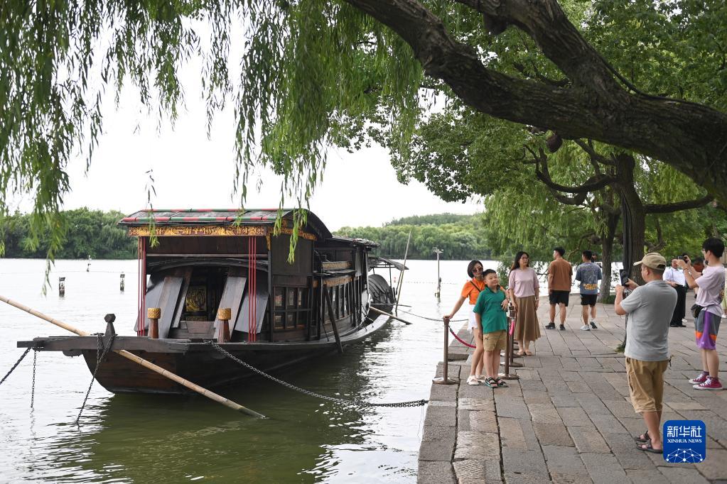 6月30日,游客在嘉兴南湖红船旁留影。