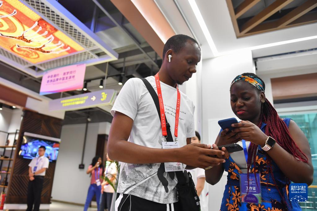 6月30日,在中非经贸合作促进创新示范园(湖南高桥大市场),来自刚果(布)的志愿者王荣(右)和参观者交换联系方式。