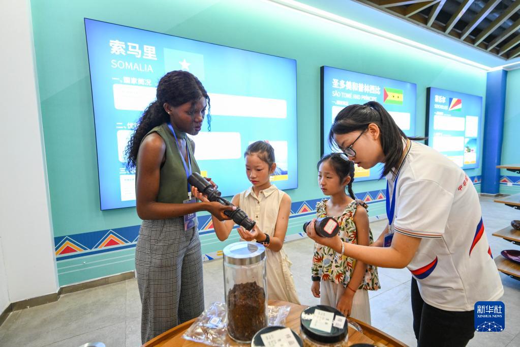 6月30日,在中非经贸合作促进创新示范园(湖南高桥大市场),来自赤道几内亚的志愿者喜乐(左一)和来自湖南信息学院的志愿者袁哲(右一)给前来参观的小朋友讲解展品。
