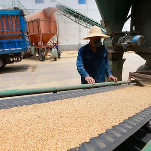 6月30日,在淮北市濉溪县韩村镇一家食品企业夏粮收购现场,工人在自动化传输线旁作业。