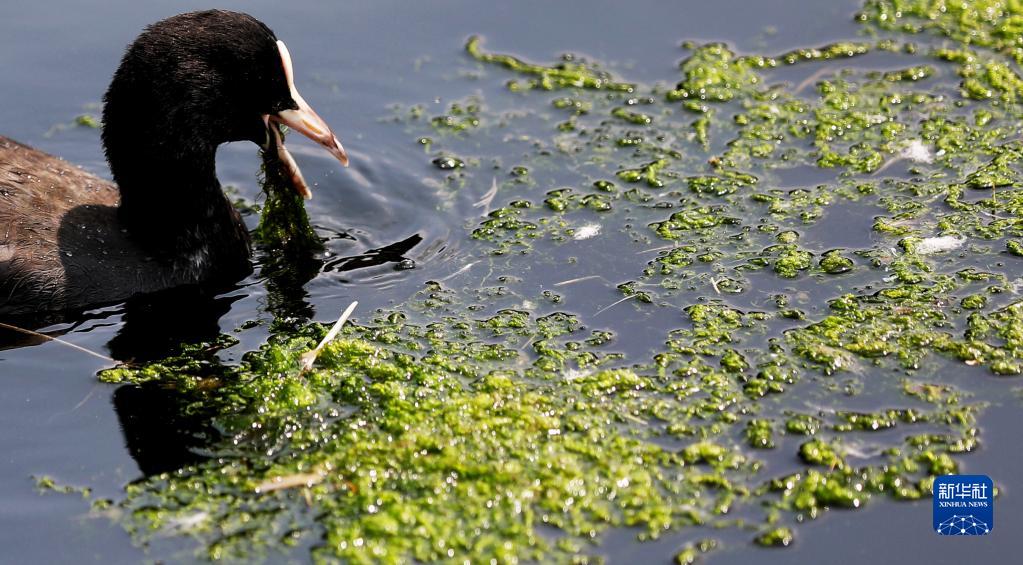 6月29日,一只白骨顶在英国伦敦泰晤士河一处浮萍中觅食。