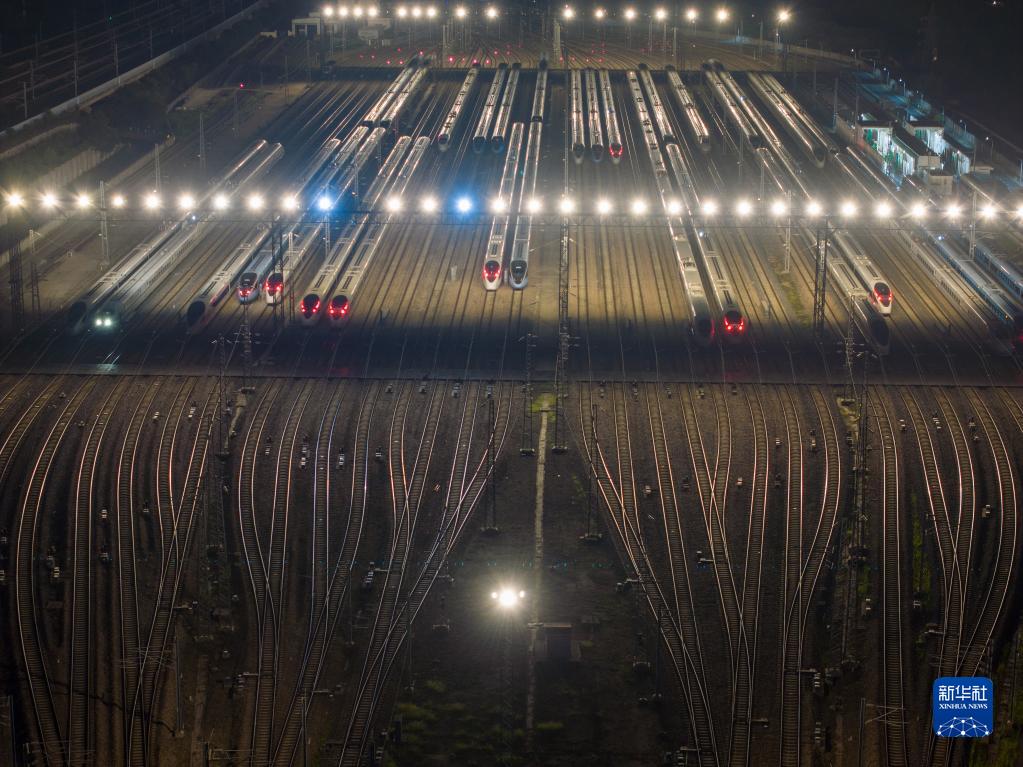 6月30日,动车组列车停靠在南京动车段南京南动车运用所(无人机照片)。