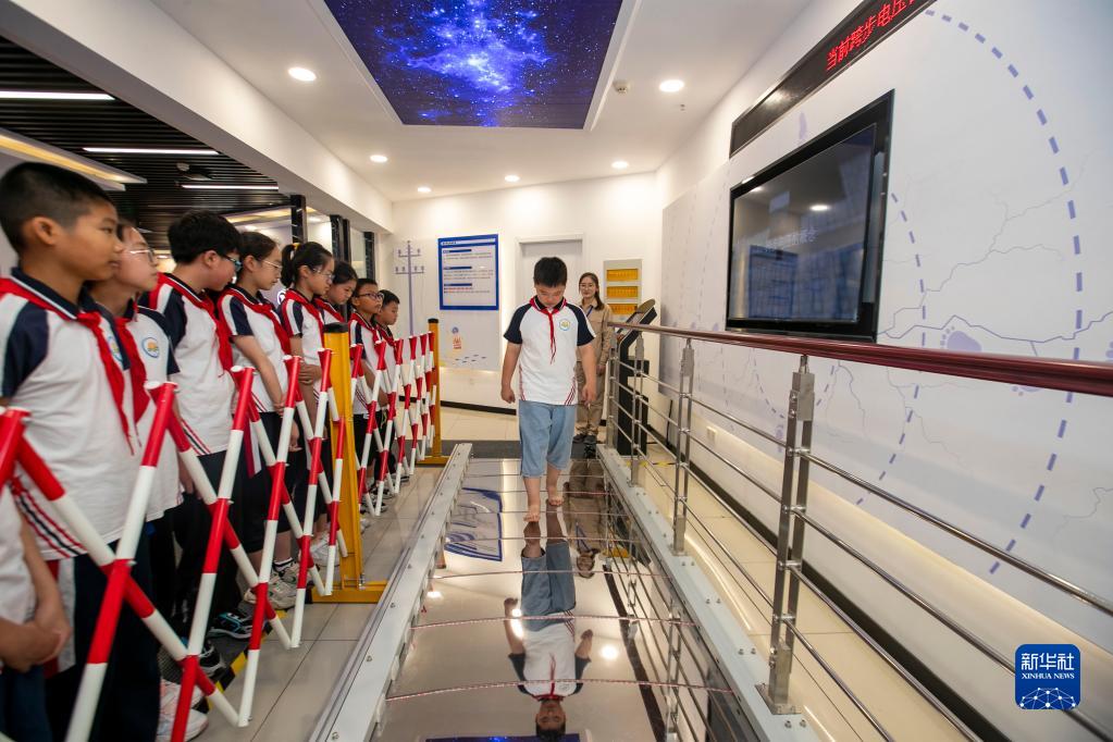 6月30日,在江苏省泰州市安全技能实训基地,讲解员指导学生进行体验,了解跨步电压的危害。