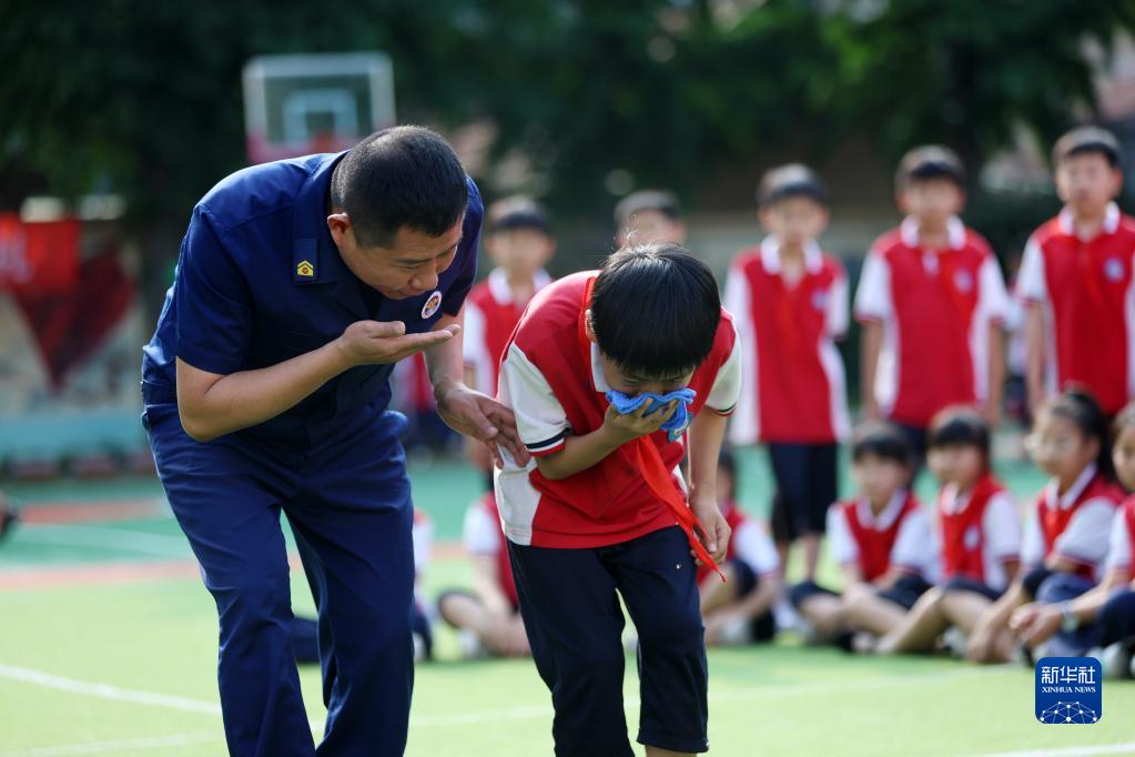 6月30日,山东省临沂市郯城县消防救援大队宣传员为红旗小学学生讲解火场逃生方法。