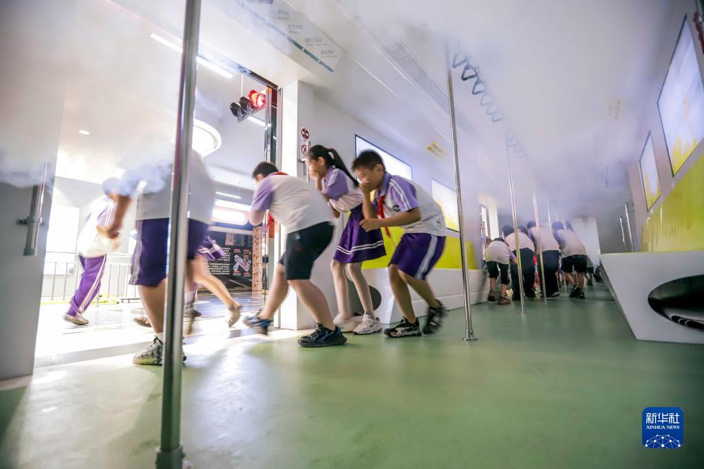 6月30日,河北省遵化市第三实验小学的学生在进行地铁逃生演练。