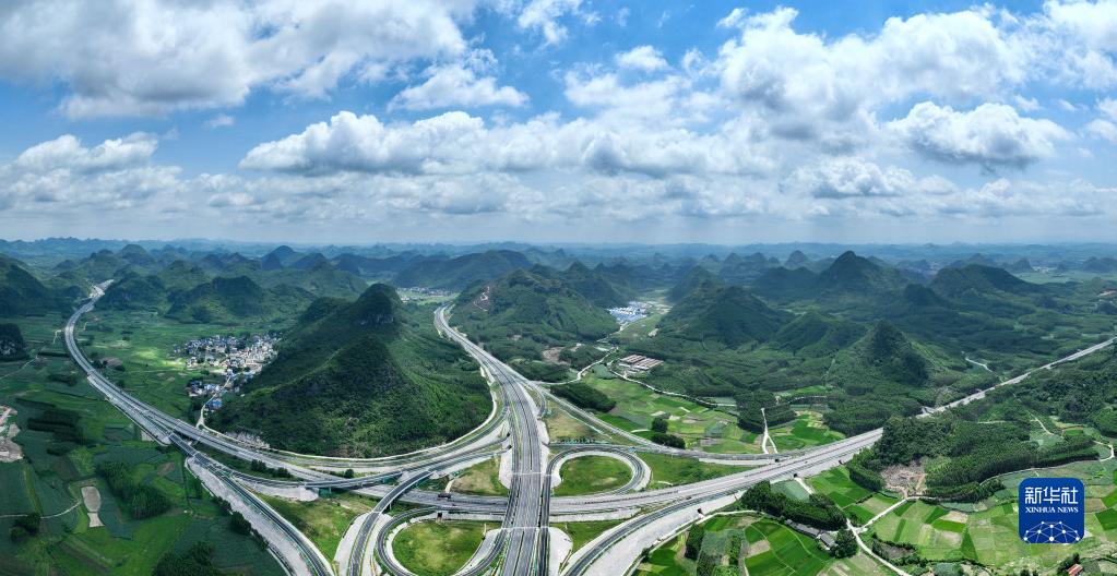 6月30日拍摄的刚建成通车的广西贺巴高速象州至柳江段马坪北枢纽互通(无人机照片)。