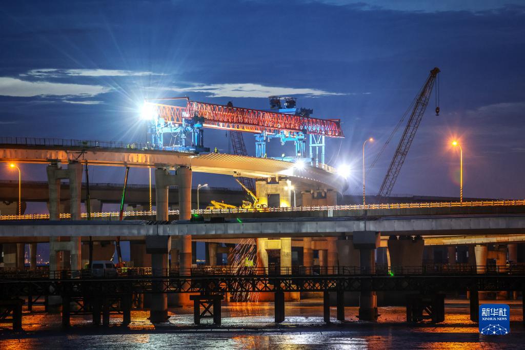 当日,在杭甬复线宁波一期滨海互通施工现场,滨海互通继主线和F匝道两次上跨之后,第三次成功跨越金塘大桥,为实现年底建成目标迈出重要一步。新华社发(姚峰摄)