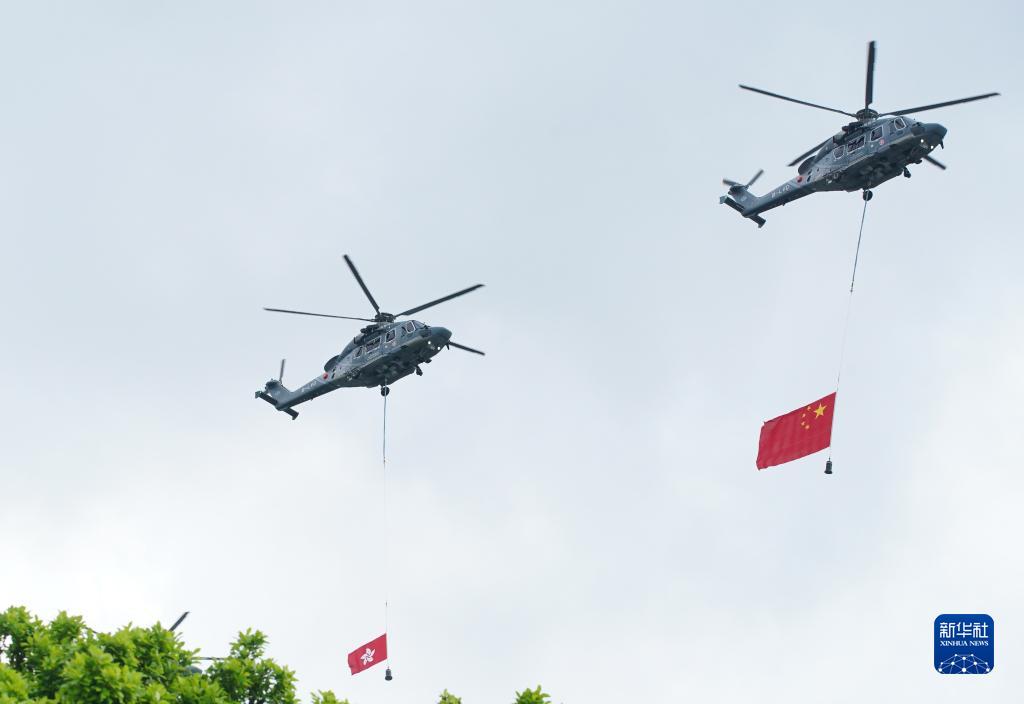 7月1日,香港特区政府在金紫荆广场举行升旗仪式,庆祝香港回归祖国26周年。这是分别悬挂中华人民共和国国旗、香港特区区旗的直升机从空中飞过。