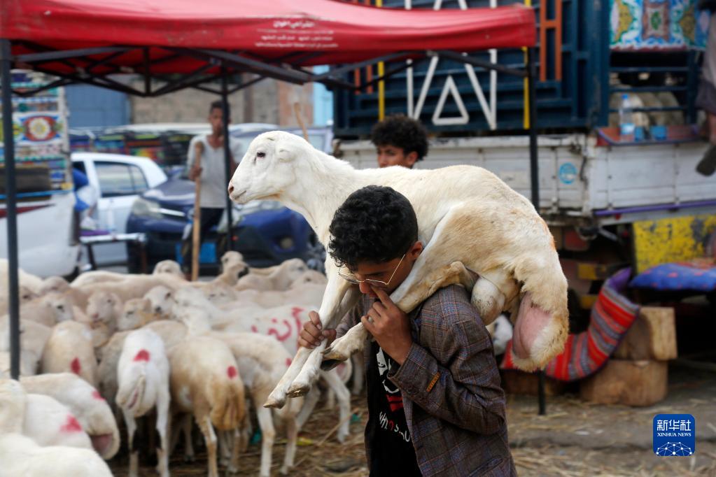 6月25日,在也门萨那一处牲畜市场,一名少年扛着买来的羊。