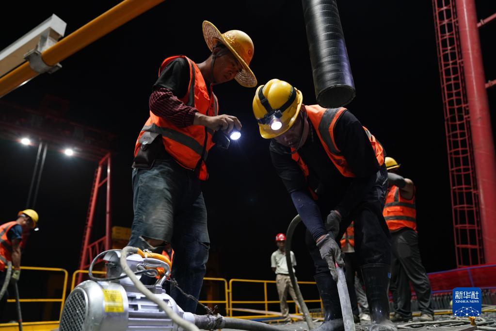 6月30日,施工人员在中铁上海工程局蓝田制梁场浇筑首榀预制箱梁。