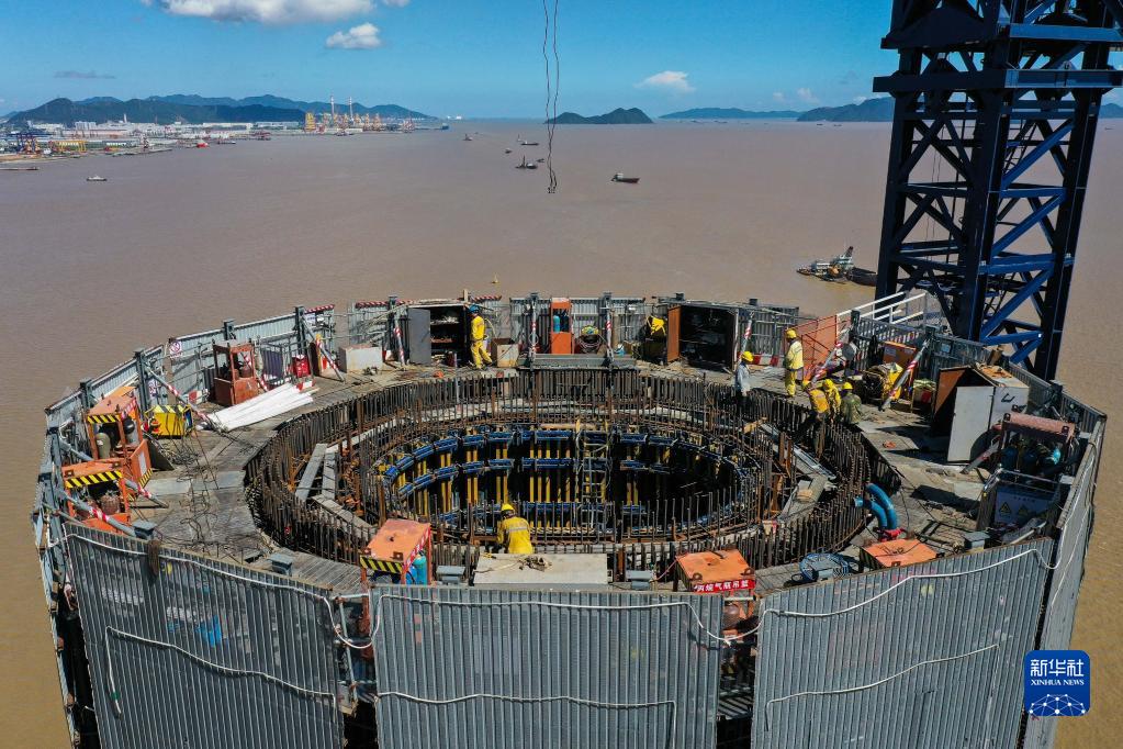 中交路建施工人员在高栏港大桥东主塔上进行浇筑准备工作(2022年7月12日摄,无人机照片)。