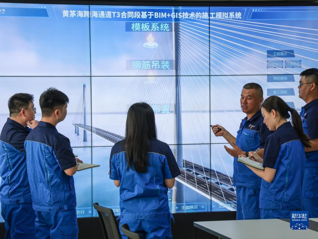 中交路建黄茅海跨海通道项目党支部书记司传波(右三)带领党员质量提升先锋小组研究BIM技术施工模拟系统(6月29日摄)。
