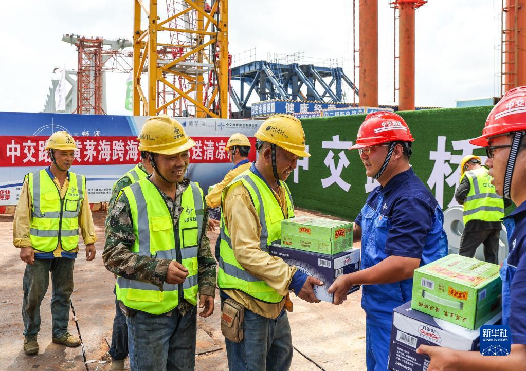 中交路建黄茅海跨海通道项目党支部为现场施工人员送清凉(6月29日摄)。
