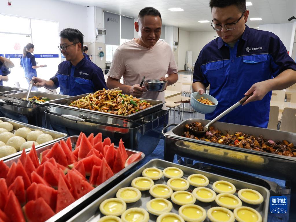 中交路建黄茅海跨海通道项目部员工在食堂就餐(6月29日摄)。