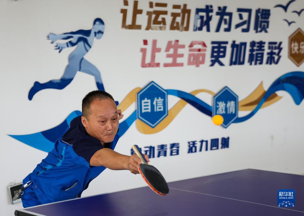 中交路建黄茅海跨海通道项目部员工在文体活动室打乒乓球(6月29日摄)。