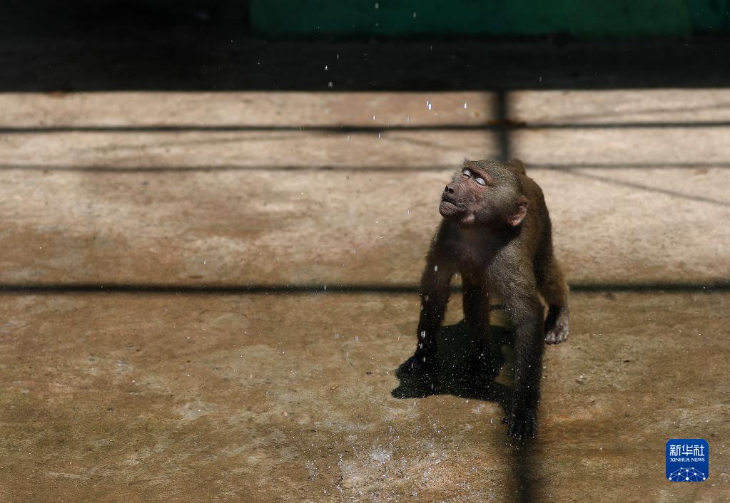 7月1日,鞍山市动物园的一只小猴享受喷水的惬意。