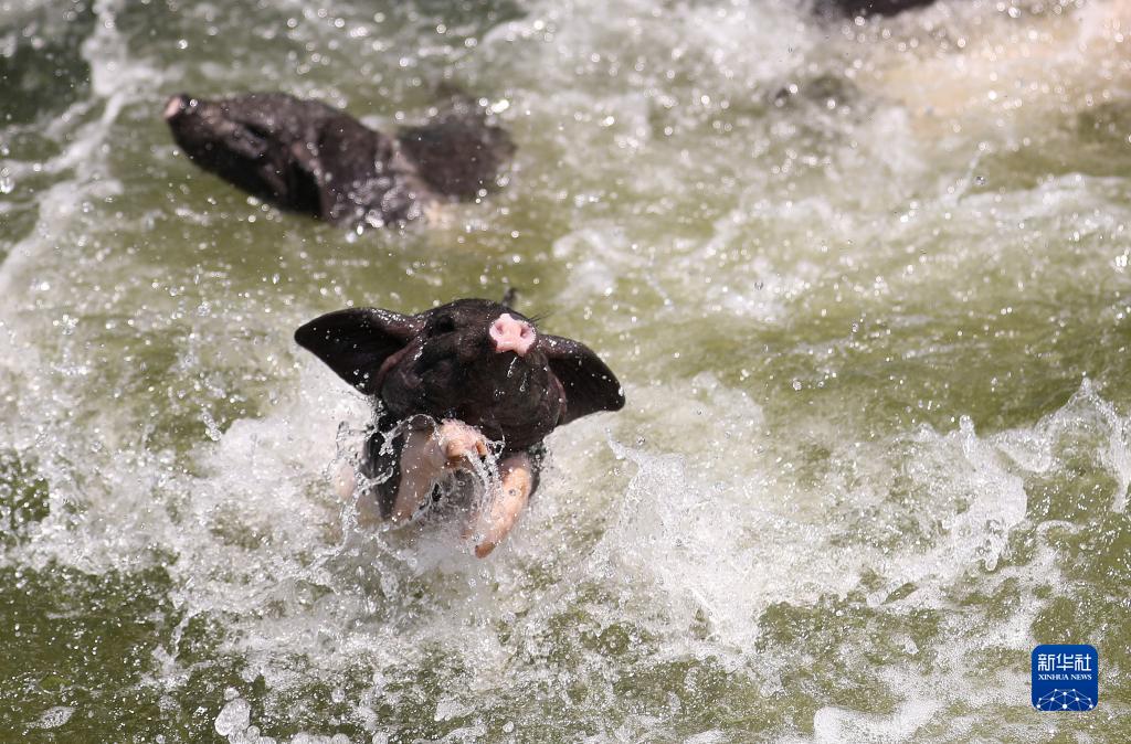 7月1日,几只小香猪在鞍山市动物园的一处水池里纳凉。