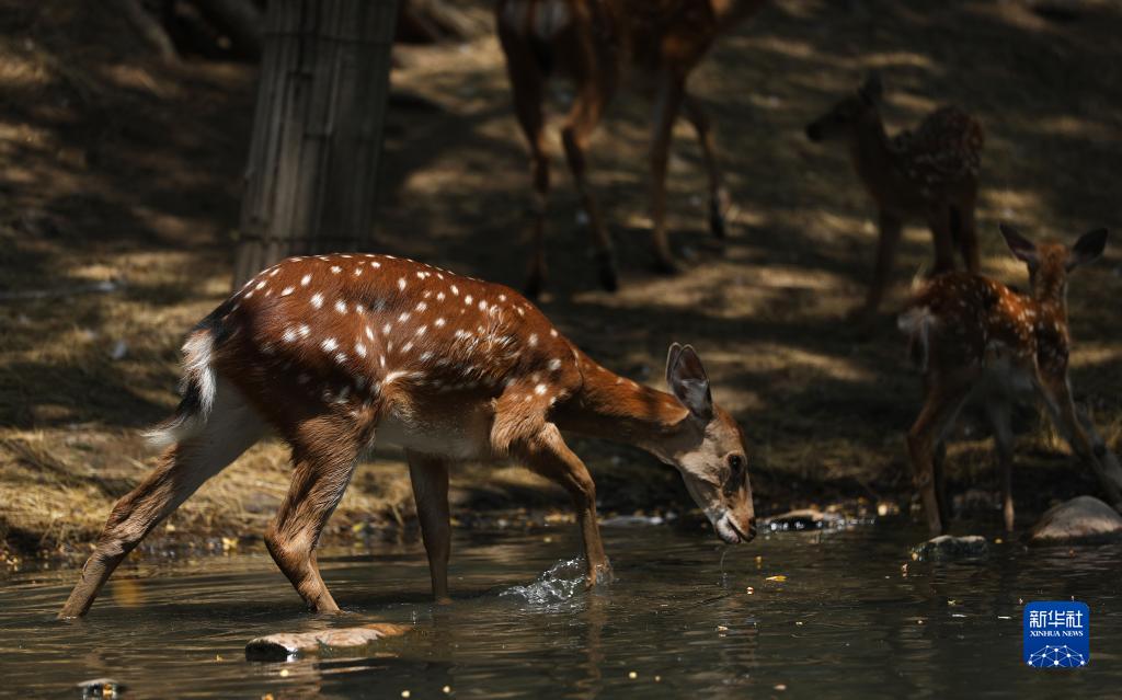 7月1日,几只梅花鹿在鞍山市动物园的小河旁避暑纳凉。