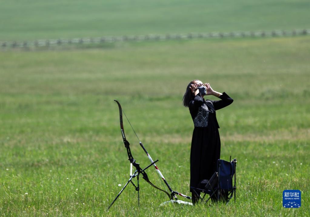 7月1日,一名参加射箭比赛的女选手在赛前整理头发。