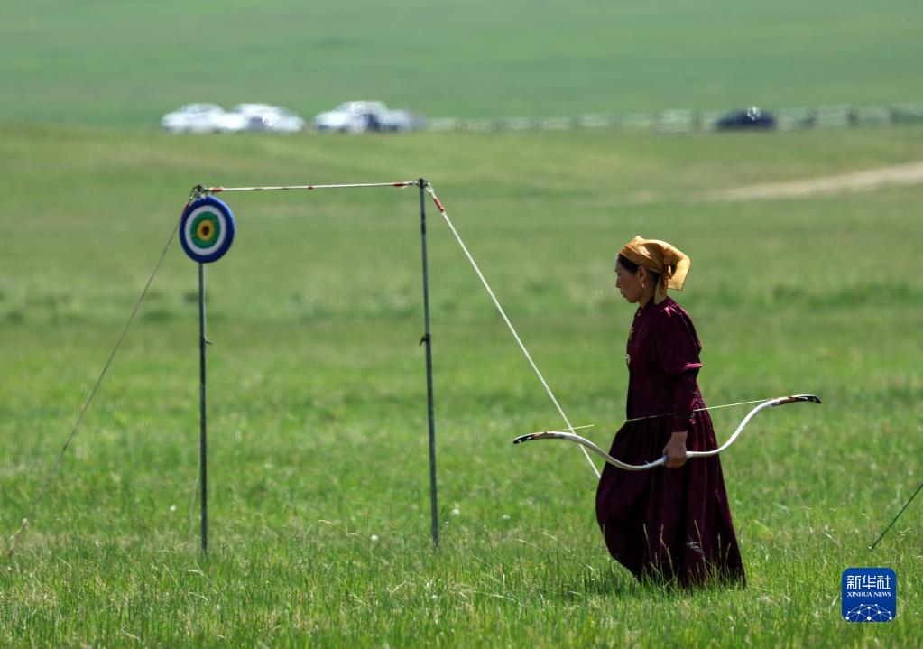 7月1日,一名参加射箭比赛的女选手去靶标后面捡拾箭支。
