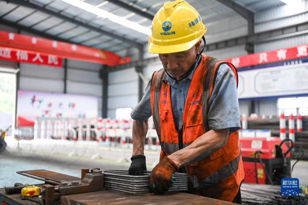 7月1日,在平陆运河马道枢纽建设现场,工人在加工钢筋构件。