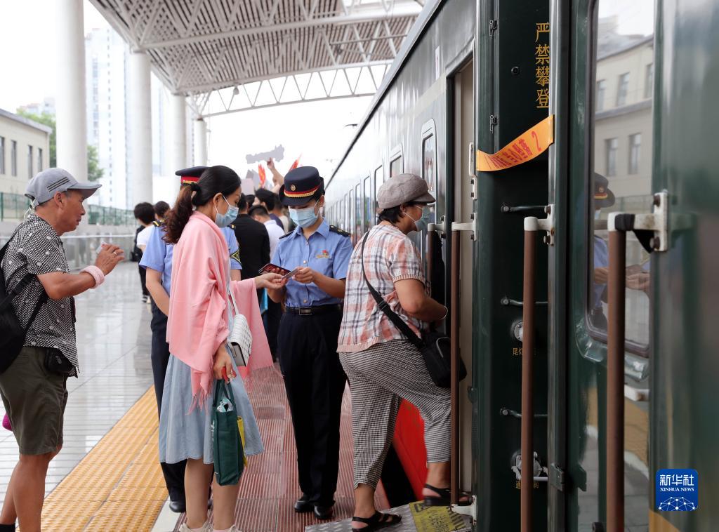 6月30日,铁路上海客运段列车员顾书闻在车门口验票。