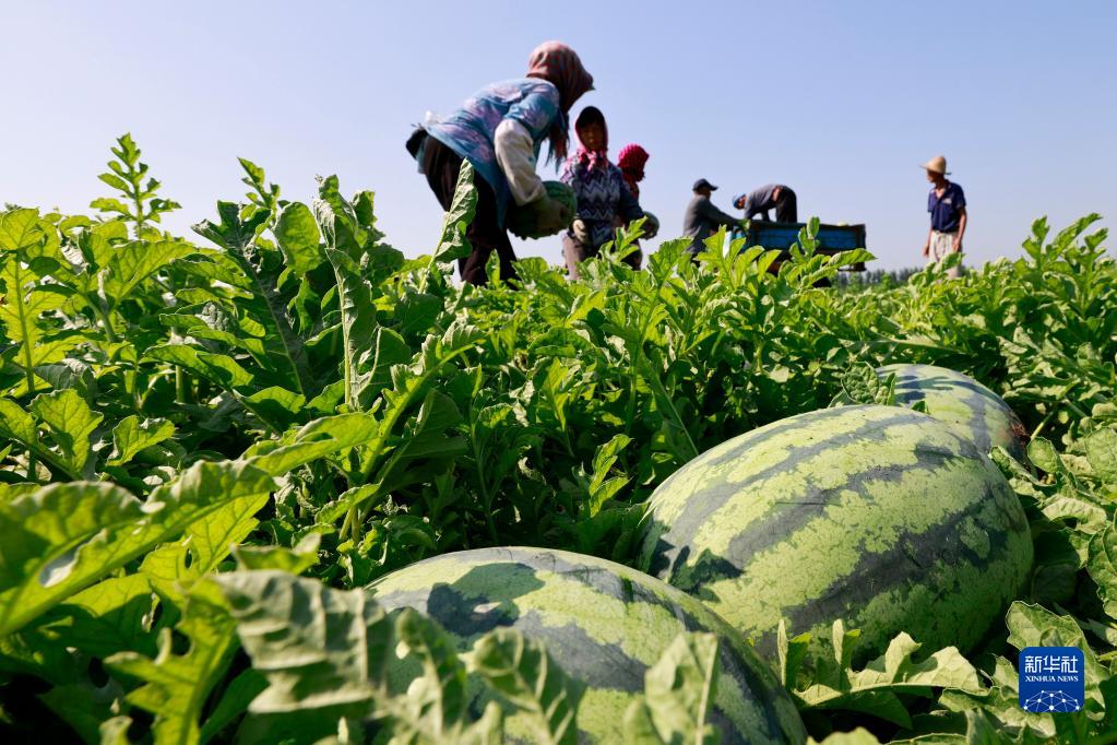 7月1日,河北省唐山市丰南区东田庄乡亚庄子村农民在搬运采收的西瓜。