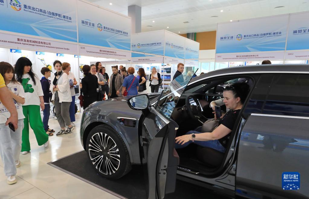 7月1日,在白俄罗斯明斯克中白工业园,参观者在展览会上体验中国生产的电动汽车。