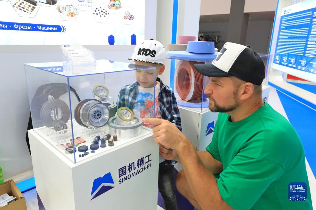 7月1日,在白俄罗斯明斯克中白工业园,参观者在展览会上观看展品。