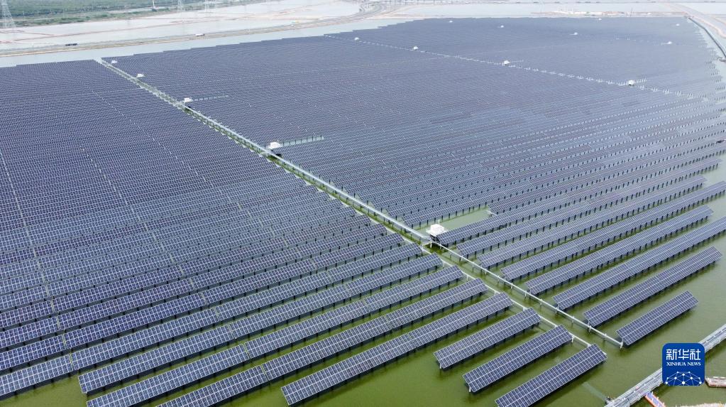 这是7月1日拍摄的龙源天津海晶盐光互补项目一景(无人机照片)。