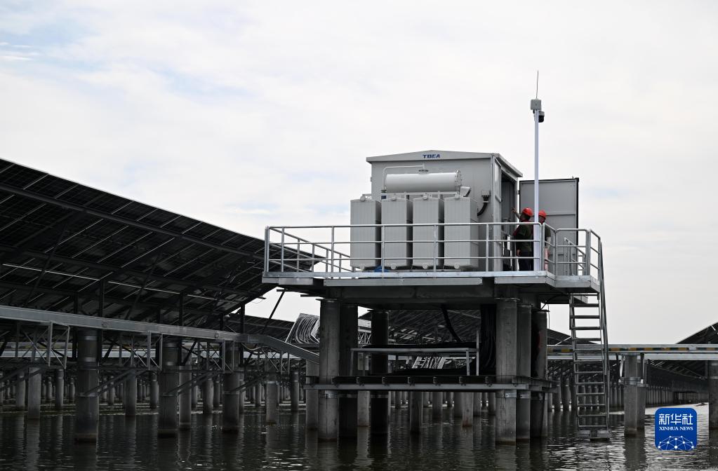 7月1日,在龙源天津海晶盐光互补项目现场,国家能源集团龙源电力天津公司工作人员在进行箱变低压侧送电作业。
