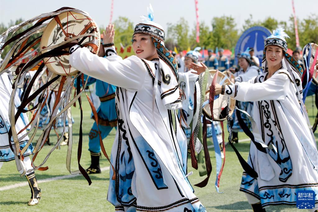 7月2日,在第十一届赫哲族乌日贡大会现场,赫哲族选手身着传统服饰进行表演。