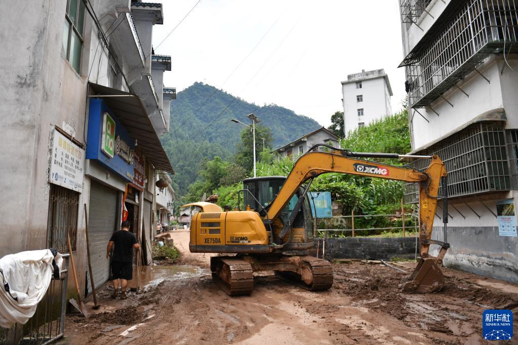 7月2日,在湖南省湘西土家族苗族自治州古丈县岩头寨镇草潭村,村民驾驶挖掘机清理淤泥。