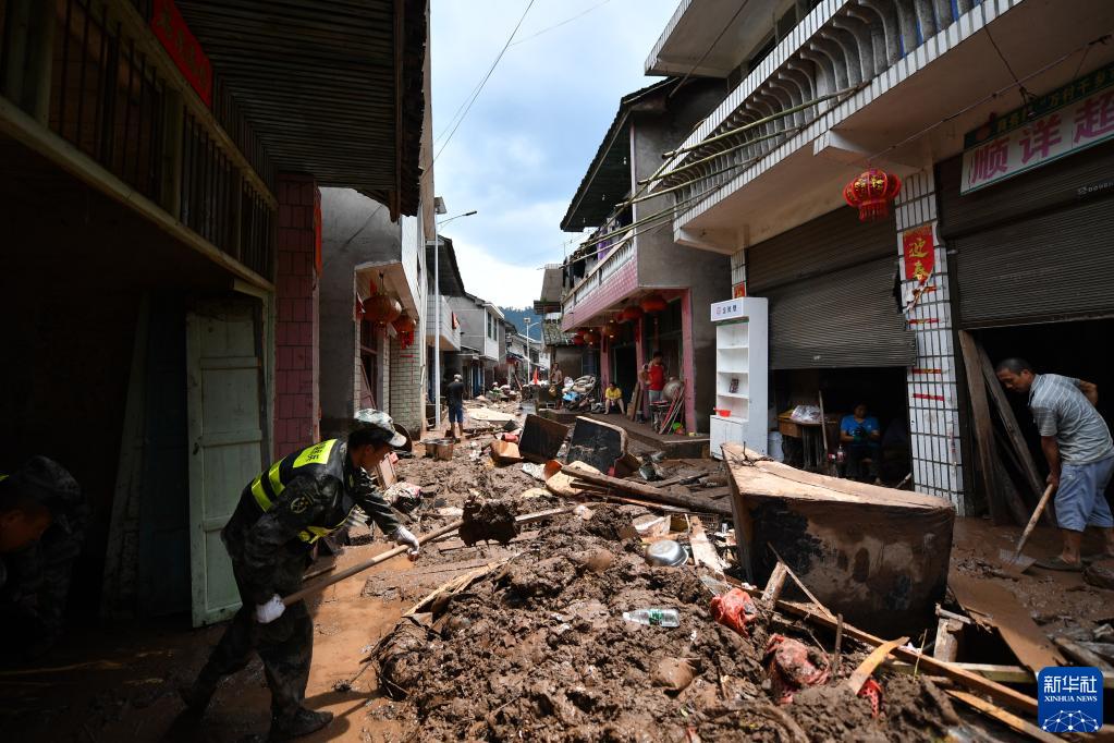 7月2日,在湖南省湘西土家族苗族自治州古丈县岩头寨镇草潭村,当地应急民兵协助村民清理淤泥和垃圾。