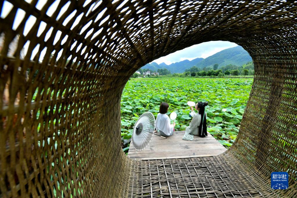 7月2日,游客在湖北省宣恩县高罗镇麻阳寨村的农家休闲山庄赏荷游玩。