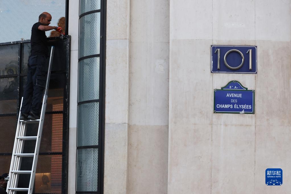 7月2日,在法国巴黎香榭丽舍大道上,工人为一家奢侈品店安装防护板。