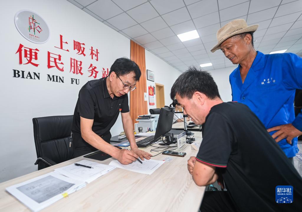 7月3日,在诸暨市店口镇上畈村的便民服务站内,代办员屠茂虎(左一)在为村民办理社保业务。