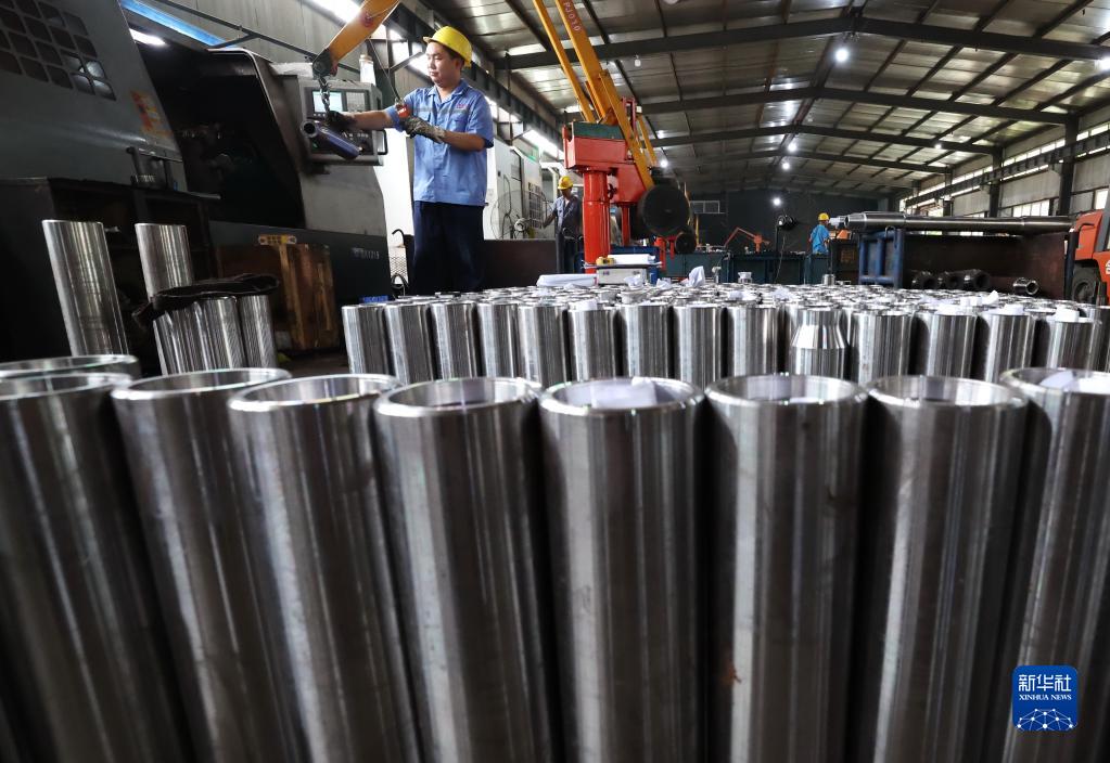 7月3日,工人在河北省晋州市营里镇一家石油钻具企业生产车间工作。